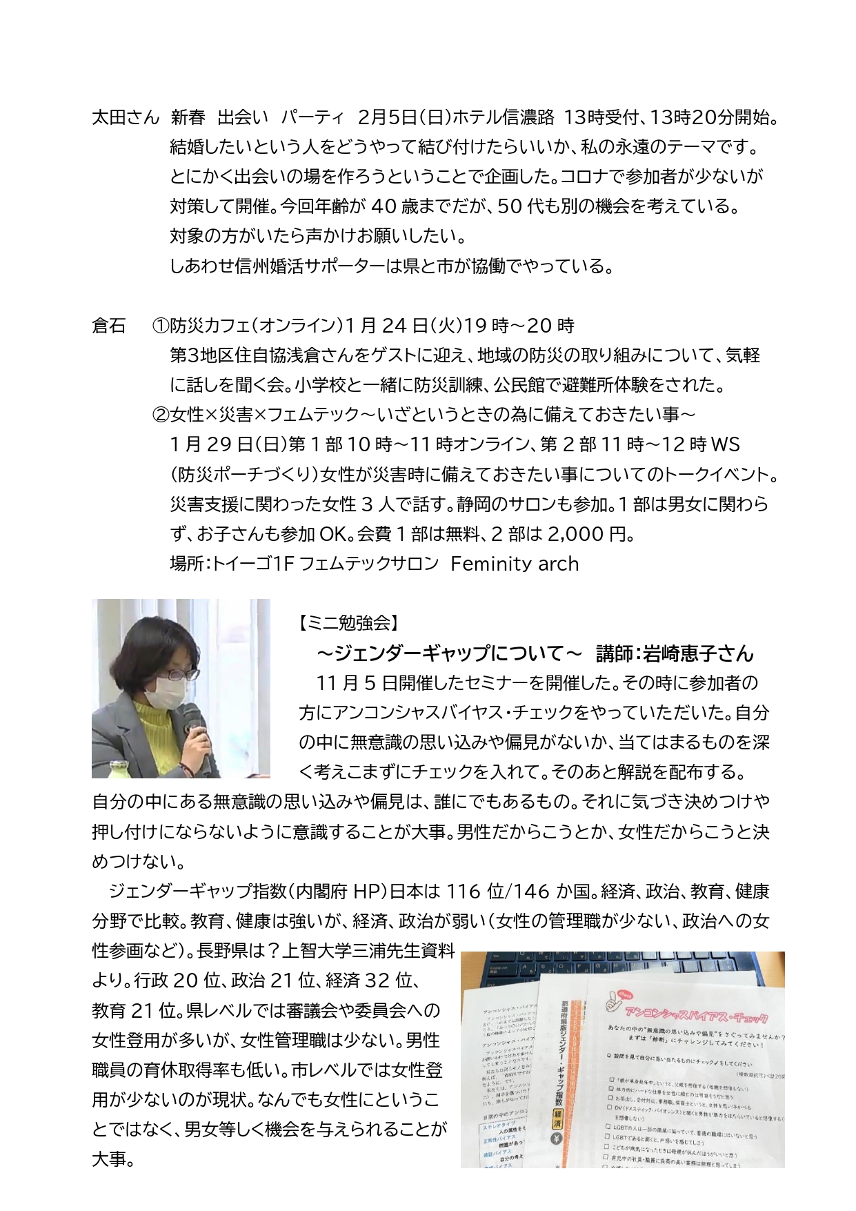 今回はジェンダーギャップについてのミニ勉強会も開催しましたので、レポートをご覧ください。(画面を1枚づつクリック)