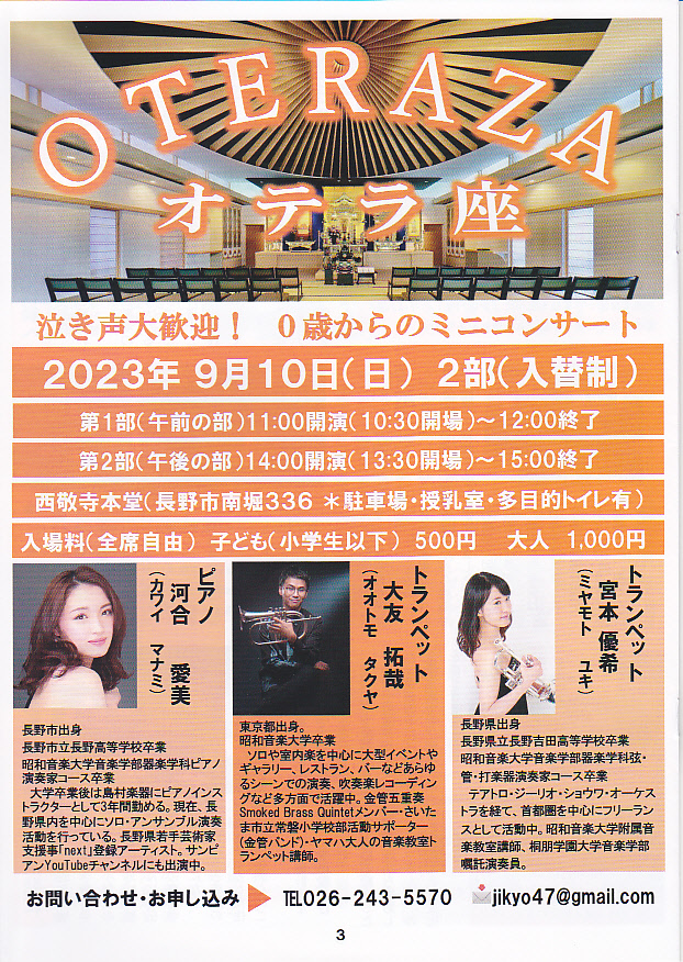 2023年9月10日(日)OTERAZA(オテラ座)鳴き声大歓迎!0歳からのミニコンサート *2部制 *西敬寺本堂 *駐車場・授乳室・多目的トイレ有 *入場料 子ども(小学生以下)500円 大人 1,000円