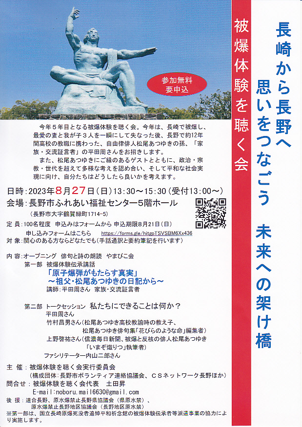 『長崎から長野へ思いをつなごう 未来への架け橋』 2023年8月27日(日)13:30~15:30(受付13:00~) *ふれあい福祉センター5階ホール *参加無料 *要申込