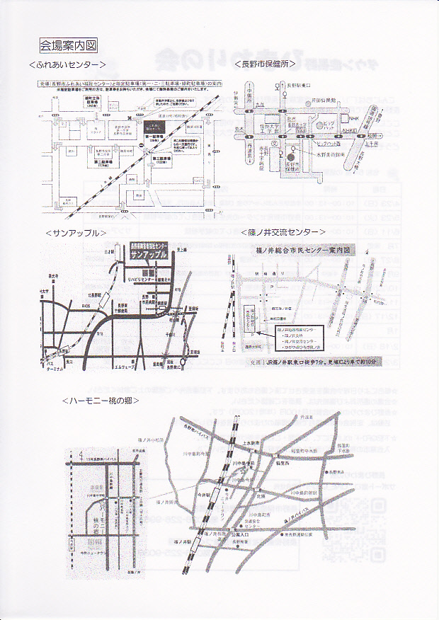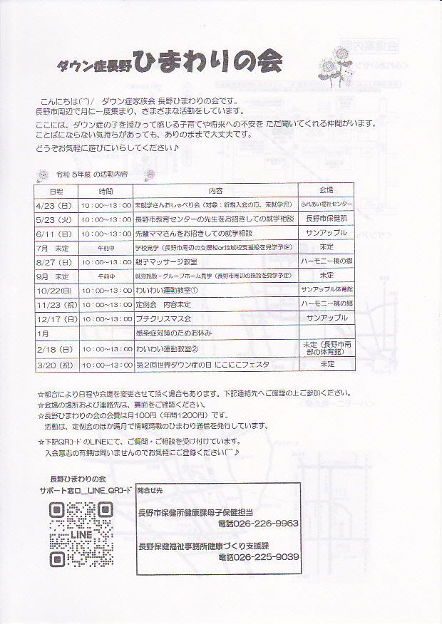 令和5年度活動内容日程表 *各会場案内図あり *会費100円/月 1200円/年 *LINEにて質問・相談を受け付けています(チラシにQRコード)