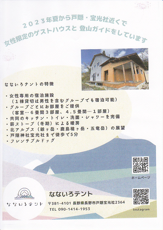 戸隠・宝光社近く 女性限定ゲストハウス・登山ガイド (HP・Instagramあり)