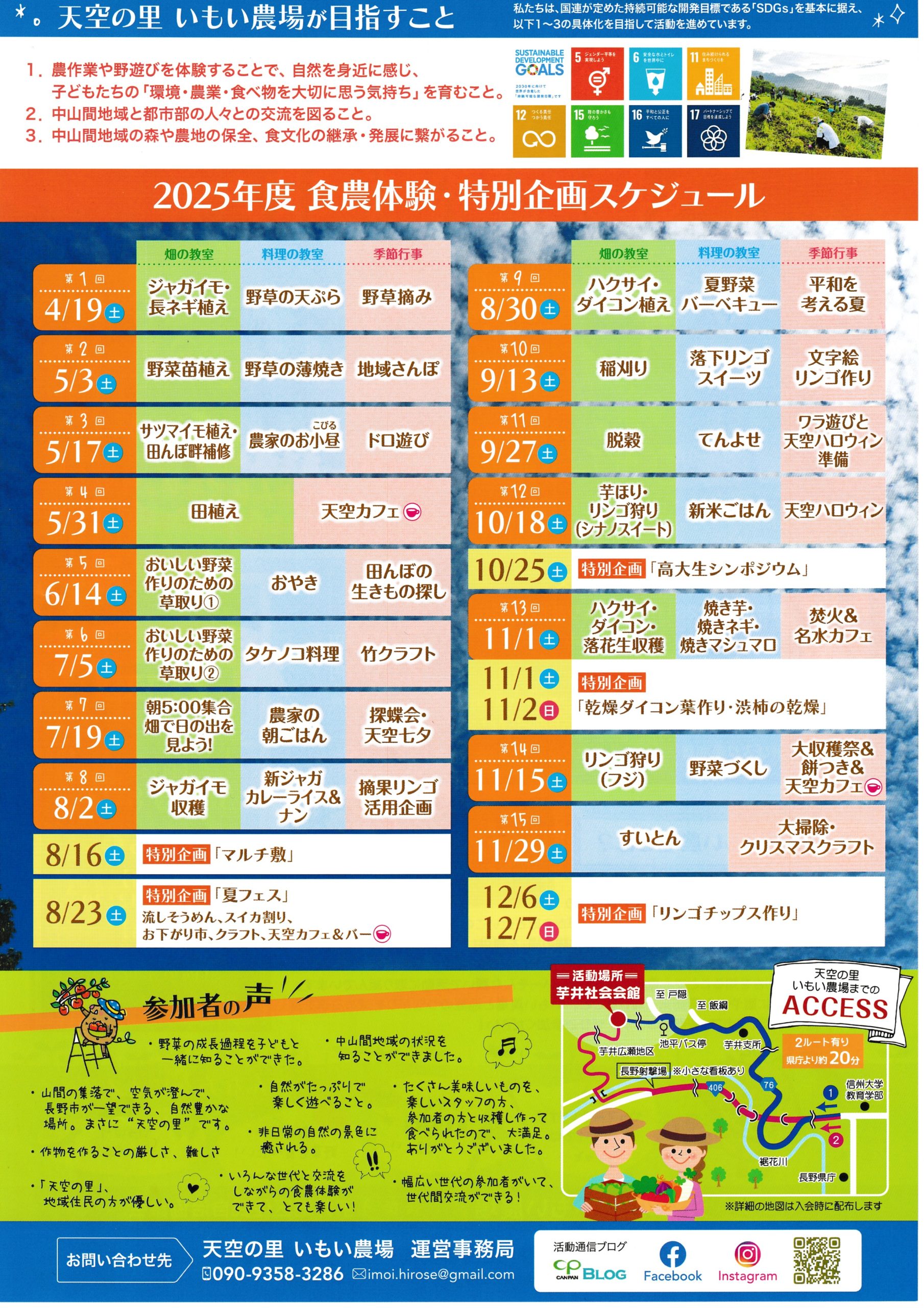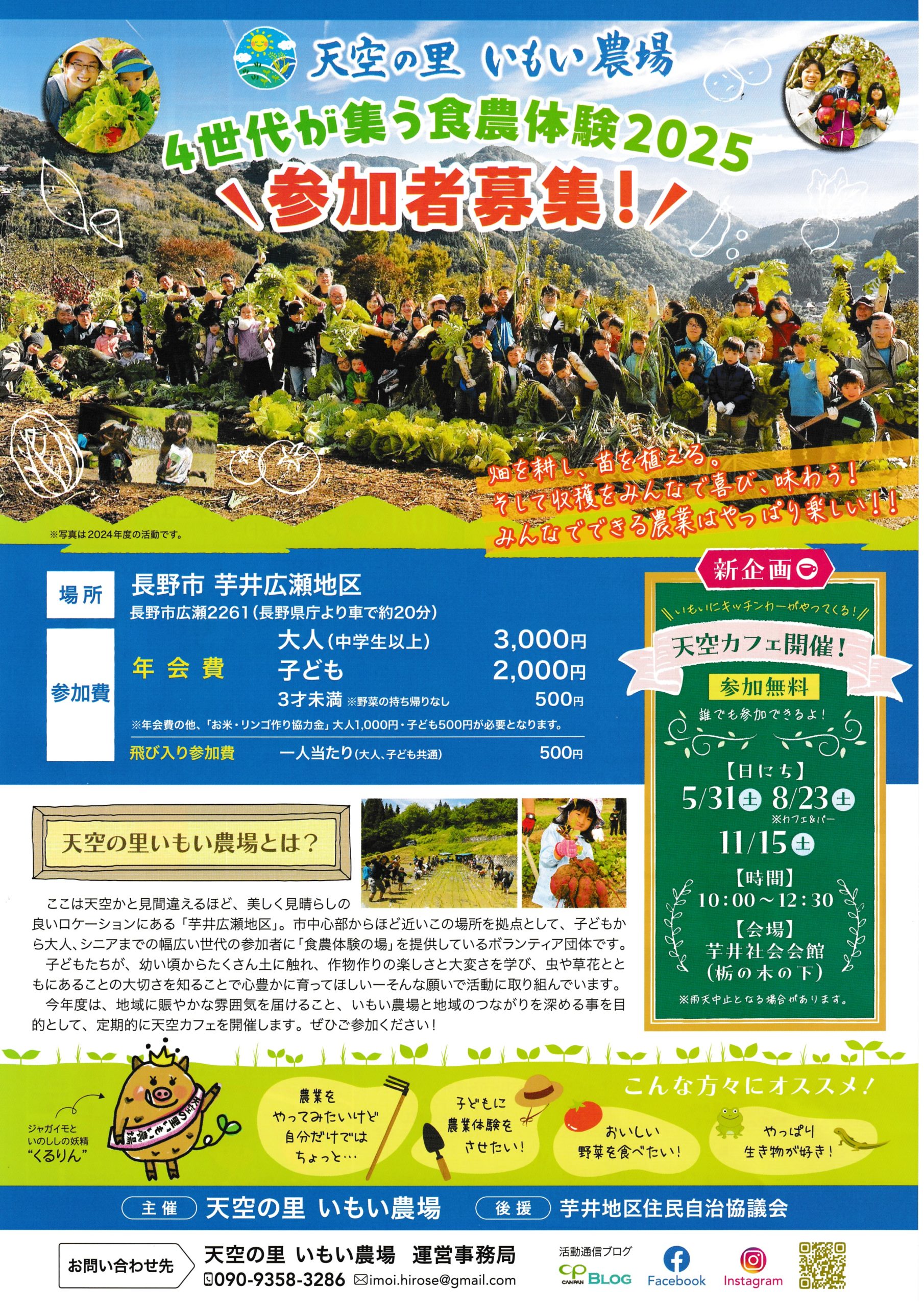 長野市芋井広瀬地区で、子どもからシニアまで幅広い世代に食農体験の場を提供しています。年間通して様々な体験ができます。今年は誰でも参加できる天空カフェも開催!とても人気の農業体験ですのでお早めにお申し込みください。