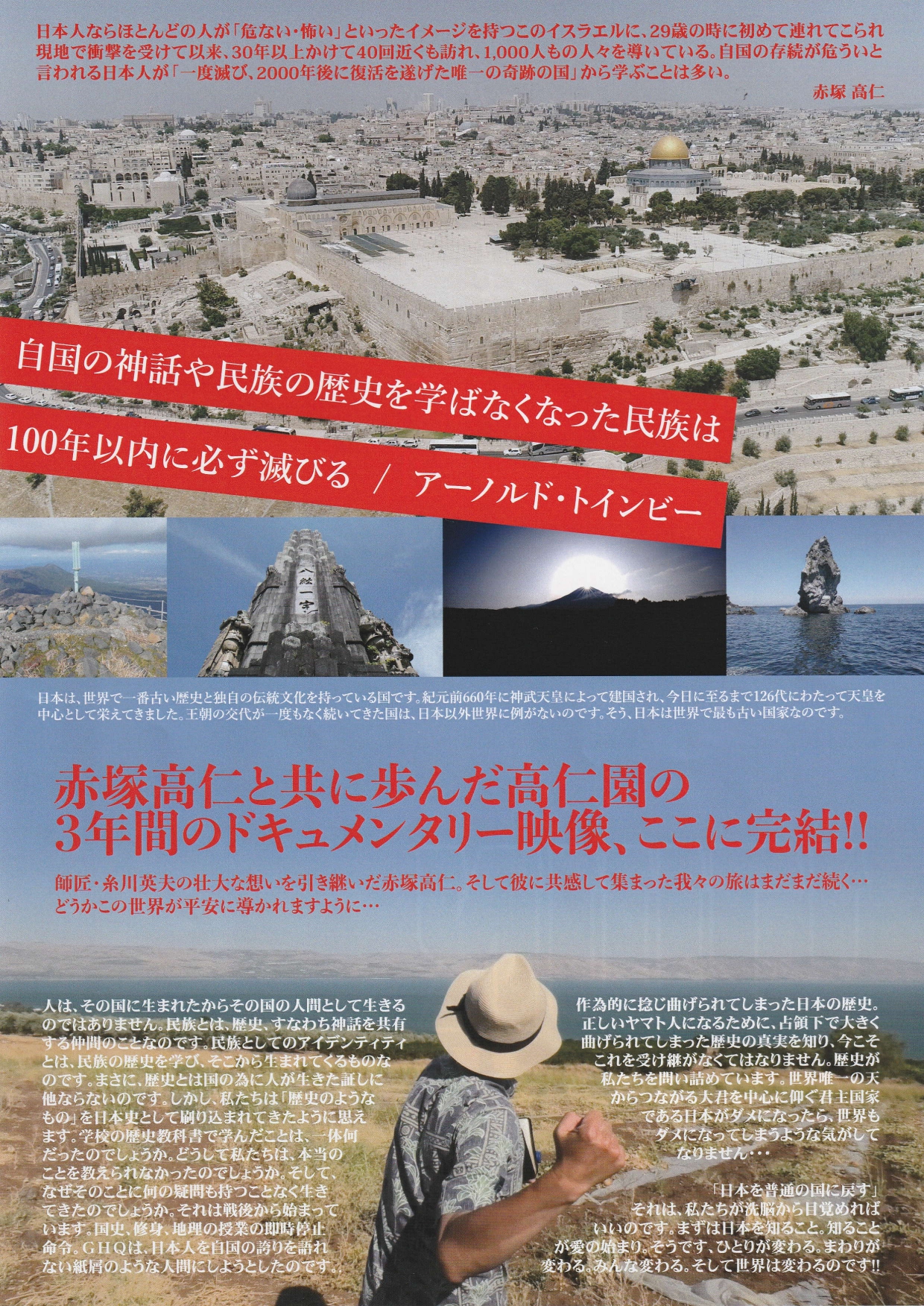 イスラエルが舞台、42回目イスラエルに行った赤塚高仁さんと共に歩んだ高仁園の3年間のドキュメンタリー映像。イスラエルから日本を見たくて、込山さんも36回目に行き映画にも登場します。